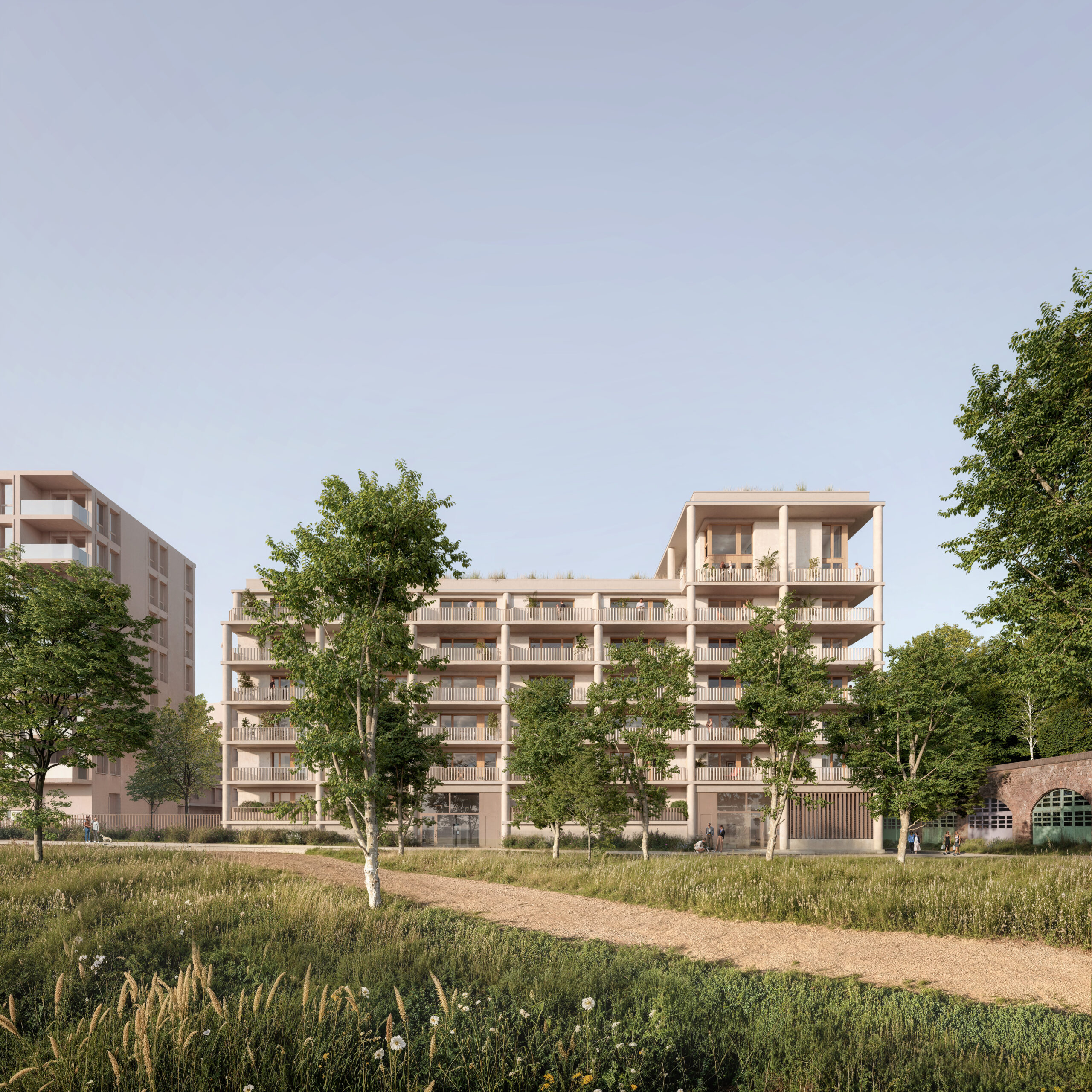 La résidence profite d’un emplacement privilégié : à proximité immédiate des casemates réhabilitées en futurs ateliers d’artistes, en surplomb de la voie verte, et face au grand parc qui s’offre en panorama depuis les appartements.