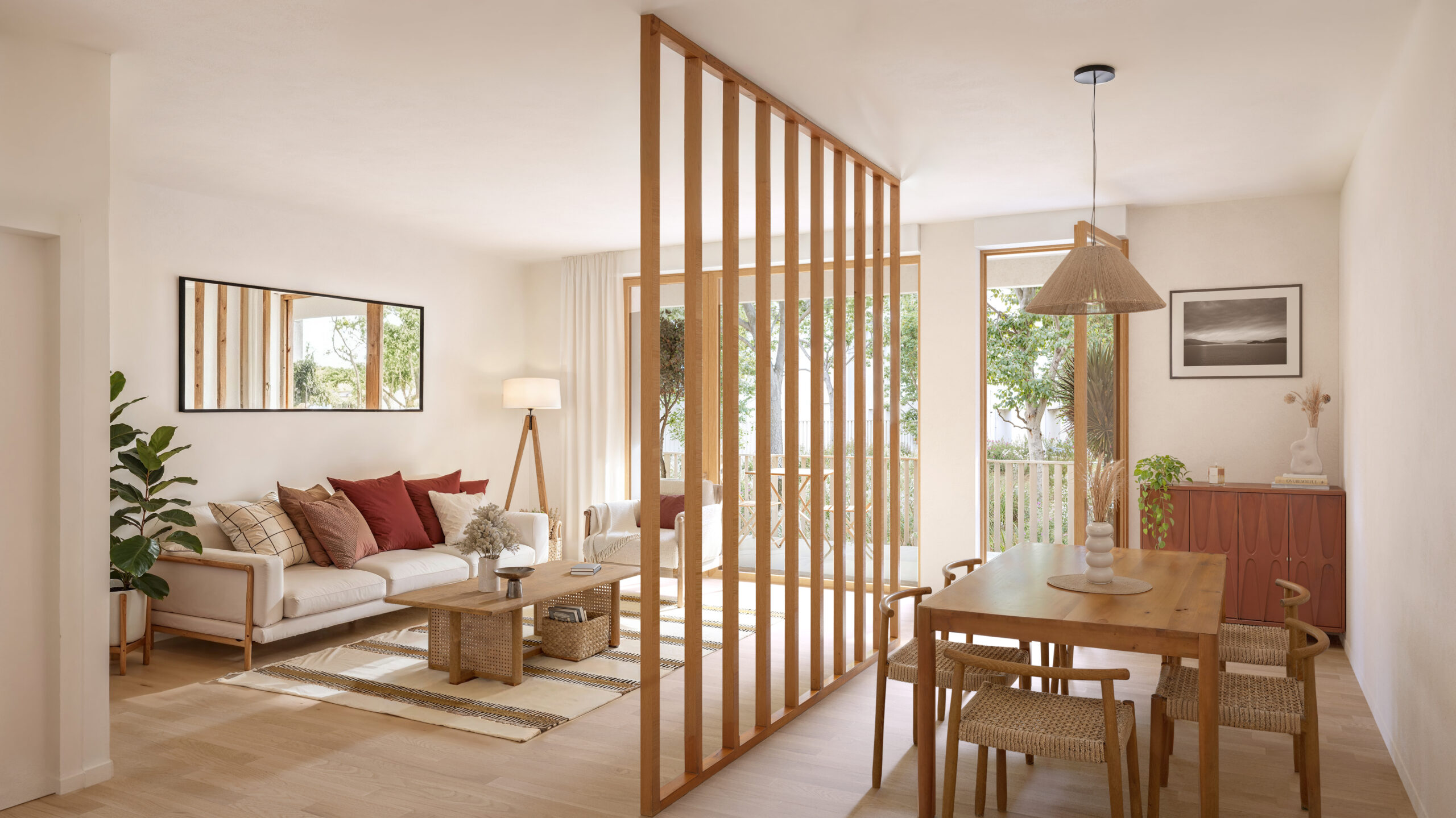 Les appartements se distinguent par leurs volumes généreux et leur lumière naturelle omniprésente. La majorité des logements sont traversants ou bi-orientés, offrant ainsi une clarté exceptionnelle et de larges espaces extérieurs qui prolongent le confort vers l’extérieur. Chaque intérieur a fait l’objet d’une attention particulière. Dans certains logements, des aménagements sur mesure viennent subtilement structurer les espaces de vie : claustras séparatifs, verrières, ou encore jeux de hauteur et de revêtements bois au plafond créant ainsi des ambiances chaleureuses .
